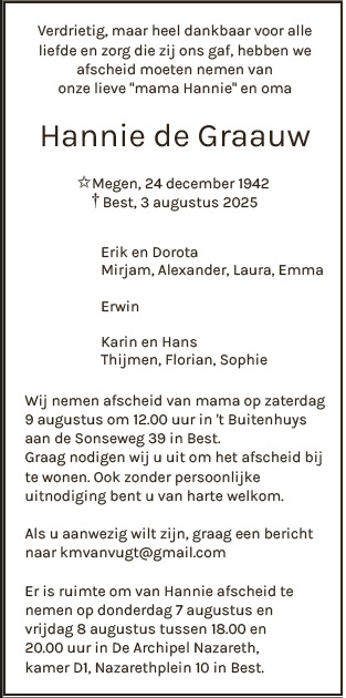 Het afscheid van Hannie vindt aanstaande zaterdag plaats, hieronder zijn de details vermeld. Wij wensen de naasten heel veel sterkte toe om dit grote verlies te verwerken en een plaats te kunnen geven.