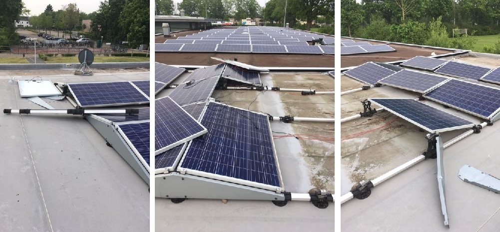 Diverse panelen zijn met de kabel en al uit de stellage getrokken, en sommige zijn zelfs van het dak af geworpen, dat laatste zou voor personen die in de buurt zijn geweest, gehoord kunnen zijn. De totale schadepost bedraagt naar een eerste voorzichtige inschatting al vlot € 10.000,00, iets waar niemand, maar onze verenging zeker niet in deze tijd, op zit te wachten.